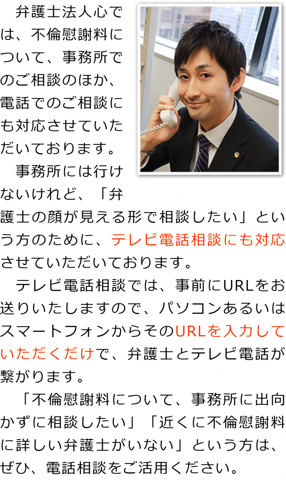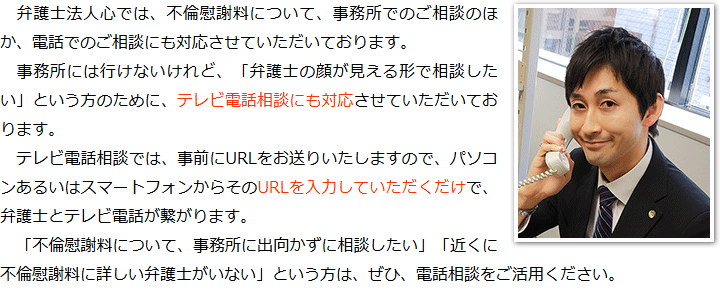 トップその他電話相談・テレビ電話相談について 階層構造▼ その他(目次) 電話相談・テレビ電話相談について その他(目次)その他トップ共通バナー元※削除不可心グループニュース(新着情報)弁護士・スタッフ選ばれる理由お役立ち情報・Q&Aお役立ち情報不倫の慰謝料請求の時効不倫慰謝料請求の際に満たすべき条件Q&A不倫慰謝料の求償権に関するQ&A電話相談・テレビ電話相談について代表メッセージプライバシーポリシー 受付時間 平日 9時~21時、土日祝 9時~18時 夜間・土日祝の相談も対応します (要予約) 所在地 〒111-1111 ●町●●建物● 0120-41-2403 お問合せ・アクセス・地図