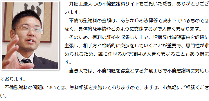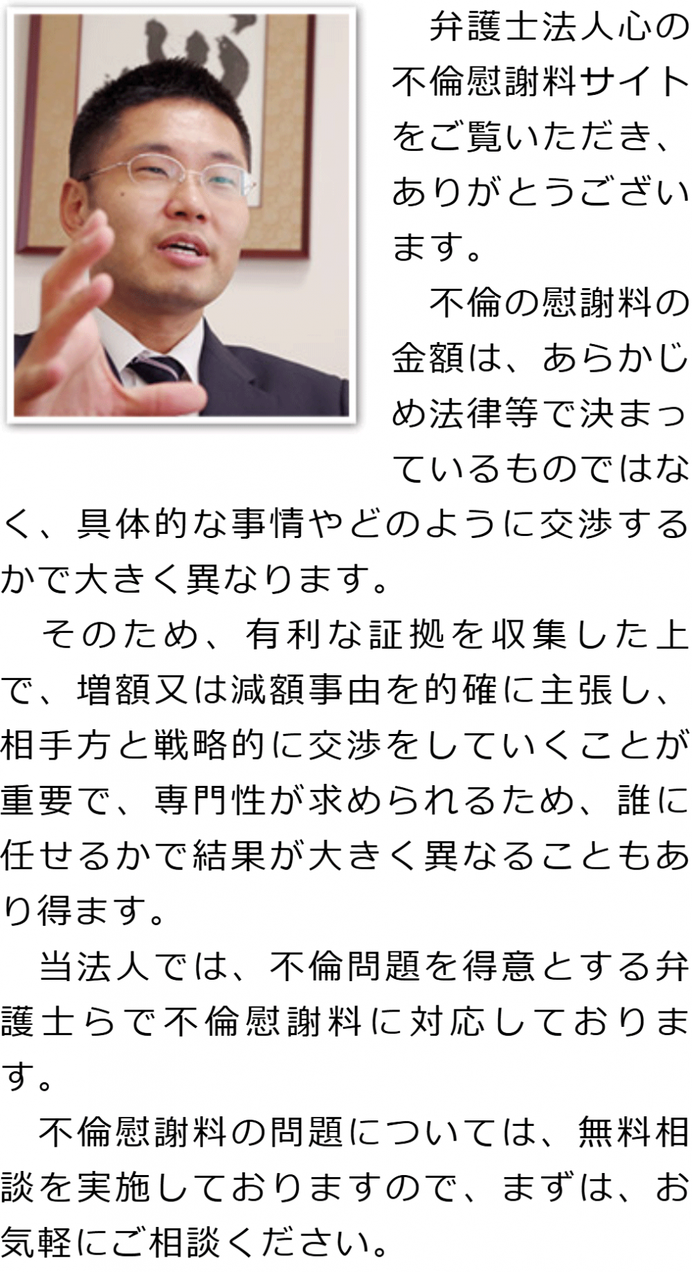 トップその他代表メッセージ 階層構造▼ その他(目次) 代表メッセージ その他(目次)その他トップ共通バナー元※削除不可心グループニュース(新着情報)弁護士・スタッフ選ばれる理由お役立ち情報・Q&Aお役立ち情報不倫の慰謝料請求の時効不倫慰謝料請求の際に満たすべき条件Q&A不倫慰謝料の求償権に関するQ&A電話相談・テレビ電話相談について代表メッセージプライバシーポリシー 受付時間 平日 9時~21時、土日祝 9時~18時 夜間・土日祝の相談も対応します (要予約) 所在地 〒111-1111 ●町●●建物● 0120-41-2403 お問合せ・アクセス・地図